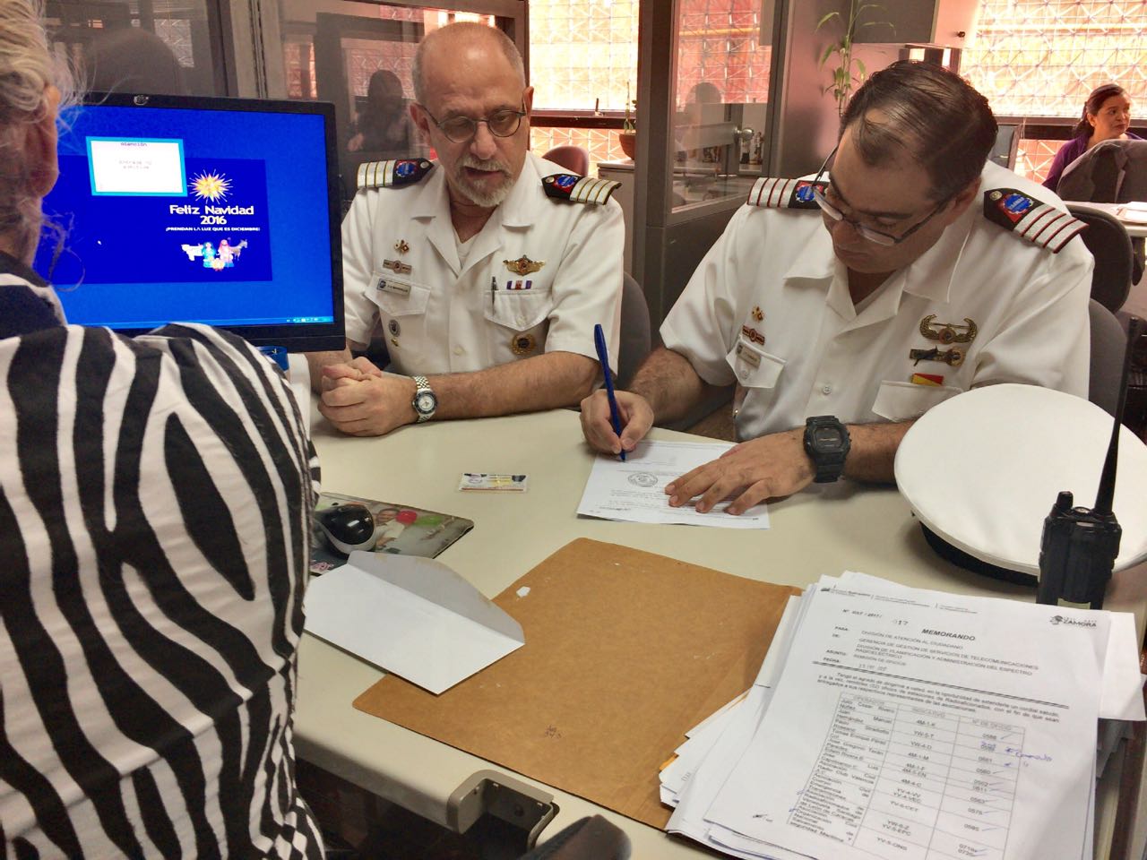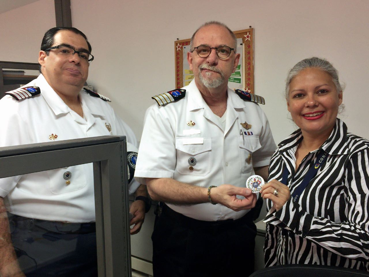 Para este acto administrativo asistieron el Comandante Nacional de Casmar y director de la Dirección de Radiocomunicaciones, DRC, el Cap. Francisco Marghella, YV5NSF y el Lic. Hector Carbonell, YV5POP, quien es miembro de la DRC y de la Fuerza de Tarea. Dicho oficio fue recibido de las manos de la Srta. Carolina Castro, YY5CCC, quien es la encargada del área de Radioaficionados de Conatel. a quien en agradecimiento por sus buenos oficios se le entrego una chapa de la DRC.