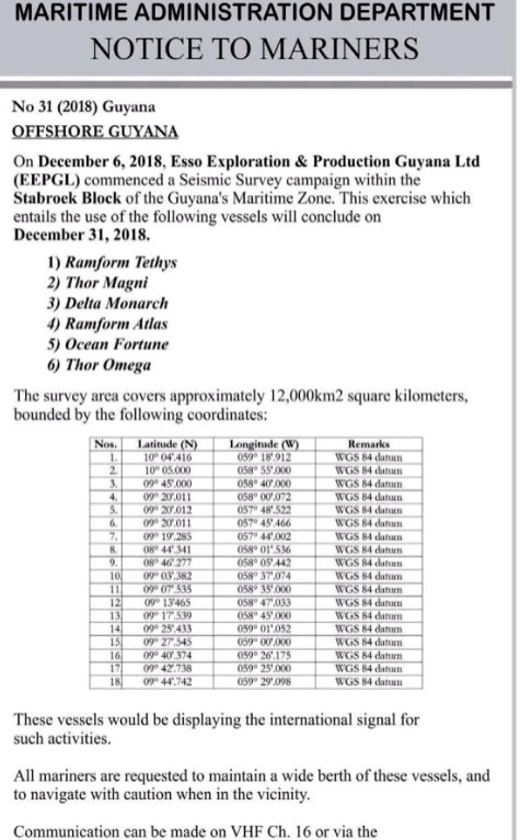 La Comisión especial de Asuntos Geográficos de Ámbito Acuático (C/E AGAA) de la Organización Nacional de Salvamento y Seguridad Marítima de los Espacios Acuáticos de Venezuela -ONSA A.C.- en virtud del de AVISO A LOS NAVEGANTES Núm. 31/2018 emitido el 06DIC2018 por la Administración Marítima del Gobierno de la República Cooperativa de Guayana, en cuanto a su planificación de actividades exploratorias dentro de la FACHADA ATLÁNTICA de República Bolivariana de Venezuela, de sus espacios acuáticos y de la Plataforma Continental hacia el Atlántico: