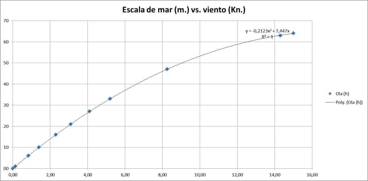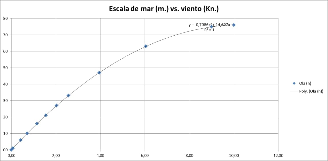 Por lo tanto, manteniendo los grados y nombres de la Escala de mar de Douglas, pero aplicando una polinómica de crecimiento del oleaje vs. el viento, obtenemos como resultado (R²=1) y con mayor exactitud y coherencia, la altura del oleaje real en nuestras aguas caribeñas, de acuerdo al factor viento, que podemos también traducirlo a la Escala Beaufort. Se adaptó la altura del oleaje con respecto a la velocidad del viento; manteniendo los grados, nombres y la altura del oleaje de la Escala de Douglas.