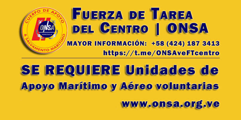 Esto es información de carácter operacional y no una declaración de ONSA Venezuela. El contenido de este espacio está sujeto a VERIFICACIÓN por las partes interesadas, antes de cualquier acción. Es únicamente con fines de apoyo informativo. La divulgación o copia no autorizada de este contenido, podrá acarrear sanciones, civiles y penales. Si usted es periodista, únase a nuestra Sala de Medios. ONSA A.C. reconoce al INEA como autoridad competente y de carácter Oficial de la República Bolivariana de Venezuela, en materia de ámbito acuático; y expresamente declara que no pretende sustituir ni sustituye en forma alguna, la información relacionada de carácter Oficial que emitan las autoridades competentes de Venezuela o de cualquier otro ente en esta materia. A los efectos de la Ley de Marinas y Actividades Conexas, artículo 75°, se considera buque en peligro aquel que pierda propulsión y no tenga posibilidad de recuperarla con medios propios; esté a punto de naufragar o exista riesgo cierto de pérdida de vidas humanas o en determinadas circunstancias, pudiera causar daños graves al ambiente.
