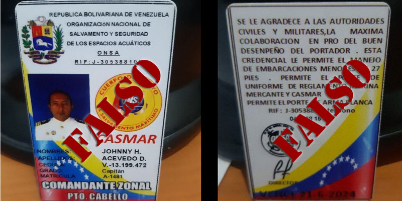 CONDENA, el porte, uso y falsificación total, de una identificación con el nombre del ciudadano detenido y arriba identificado, pero con nuestro RIF, el nombre y logotipo del Cuerpo de Apoyo & Salvamento Marítimo de nuestra organización, así como la usurpación de un rango y cargo operacional de carácter institucional interno; todo ello, de manera irregular y ajena a nuestras formas, elementos característicos de identificación y valores institucionales....Omissis... CUARTO: PROHIBIR, al denunciado, realizar cualquier publicidad o actividad de toda índole y que denote, o haga presumir vinculación alguna de su organización, con la Organización Nacional de Salvamento y Seguridad Marítima de los Espacios Acuáticos de Venezuela ONSA A.C. ...Omissis...