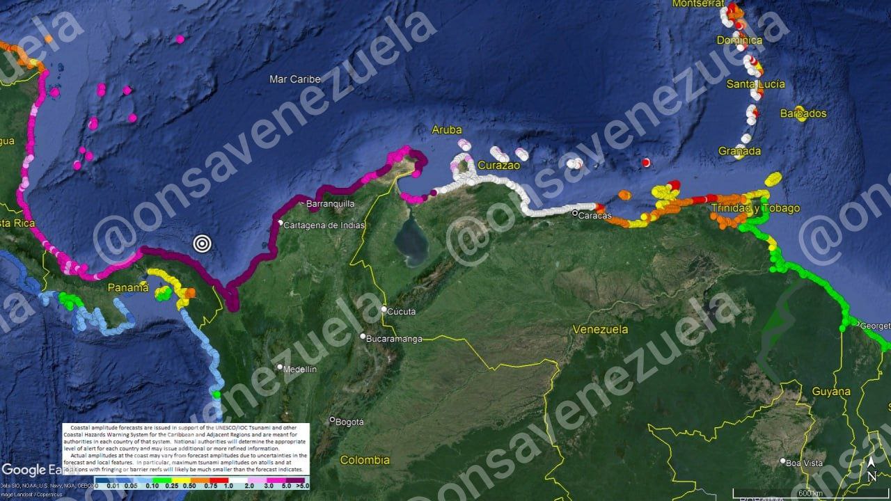 El escenario que seleccionó Venezuela, simula un tsunami generado por un sismo de magnitud 8,47 ubicado en el Cinturón Deformado del Norte de Panamá (9,80°N, 77,75°W).