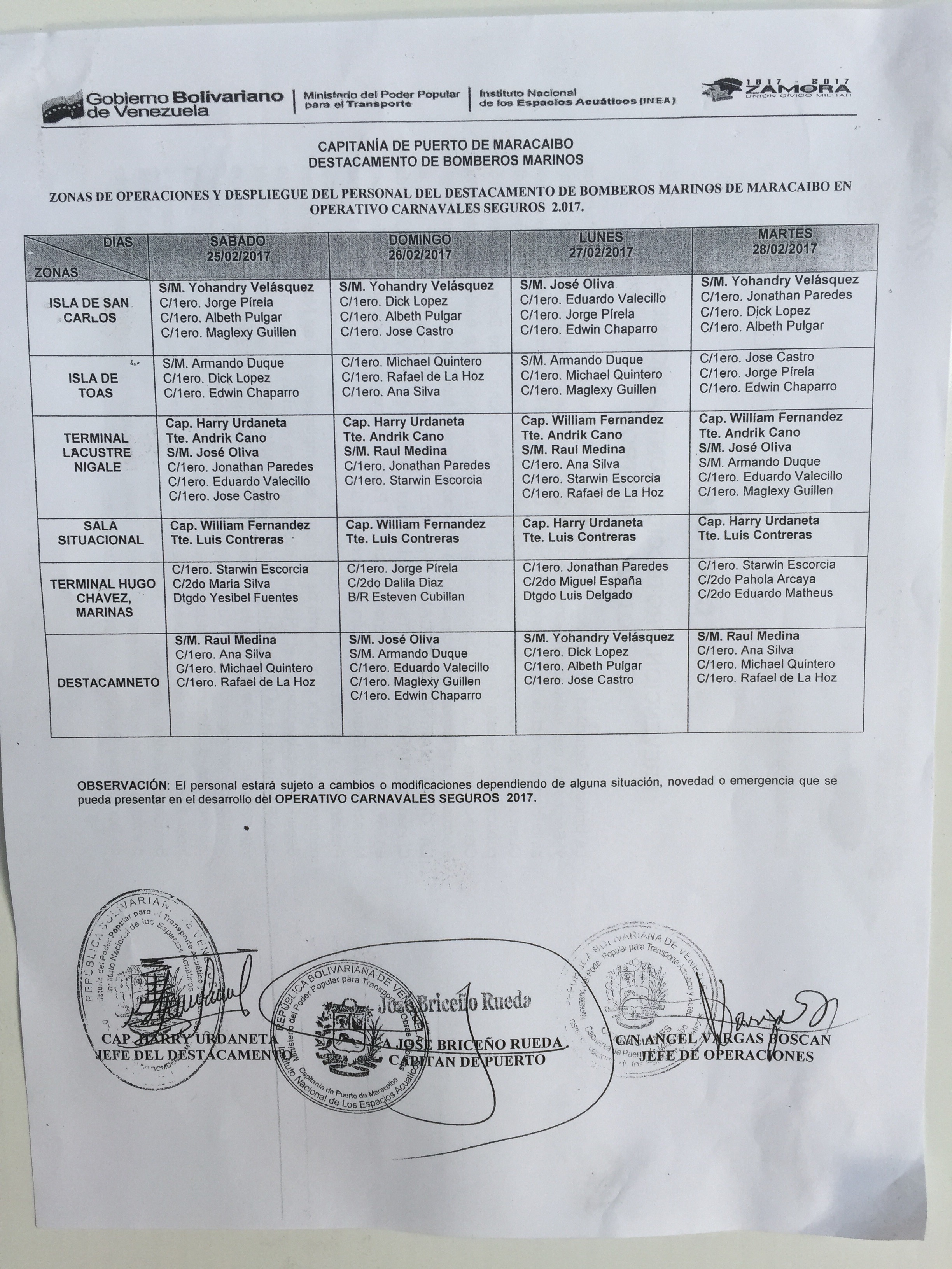 Rol de Guardia del Cuerpo de Bomberos Marinos de la Capitanía de Puerto de Maracaibo para el Operativo Carnaval 2017