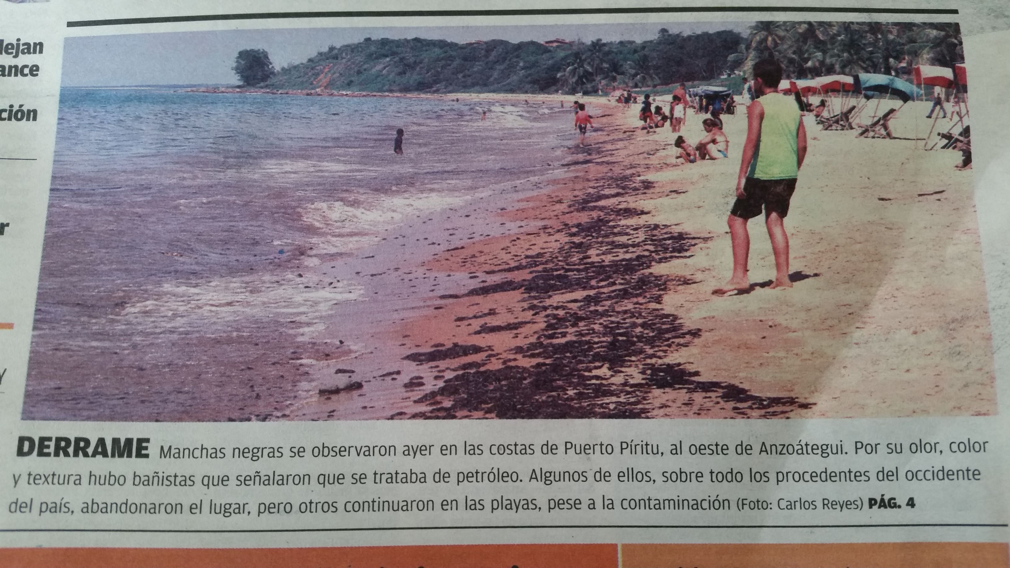 reportero24.com el día 6 de Marzo del 2012 la presencia de crudo en las playas de la bahía de Píritu. En esta oportunidad el 22 de Agosto de 2017 un nuevo derrame de crudo esta afectando las costas de Píritu, quedando demostrado el sistemático daño ecológico generado por los continuos derrames de crudo desde el Complejo Criogénico de Jose.