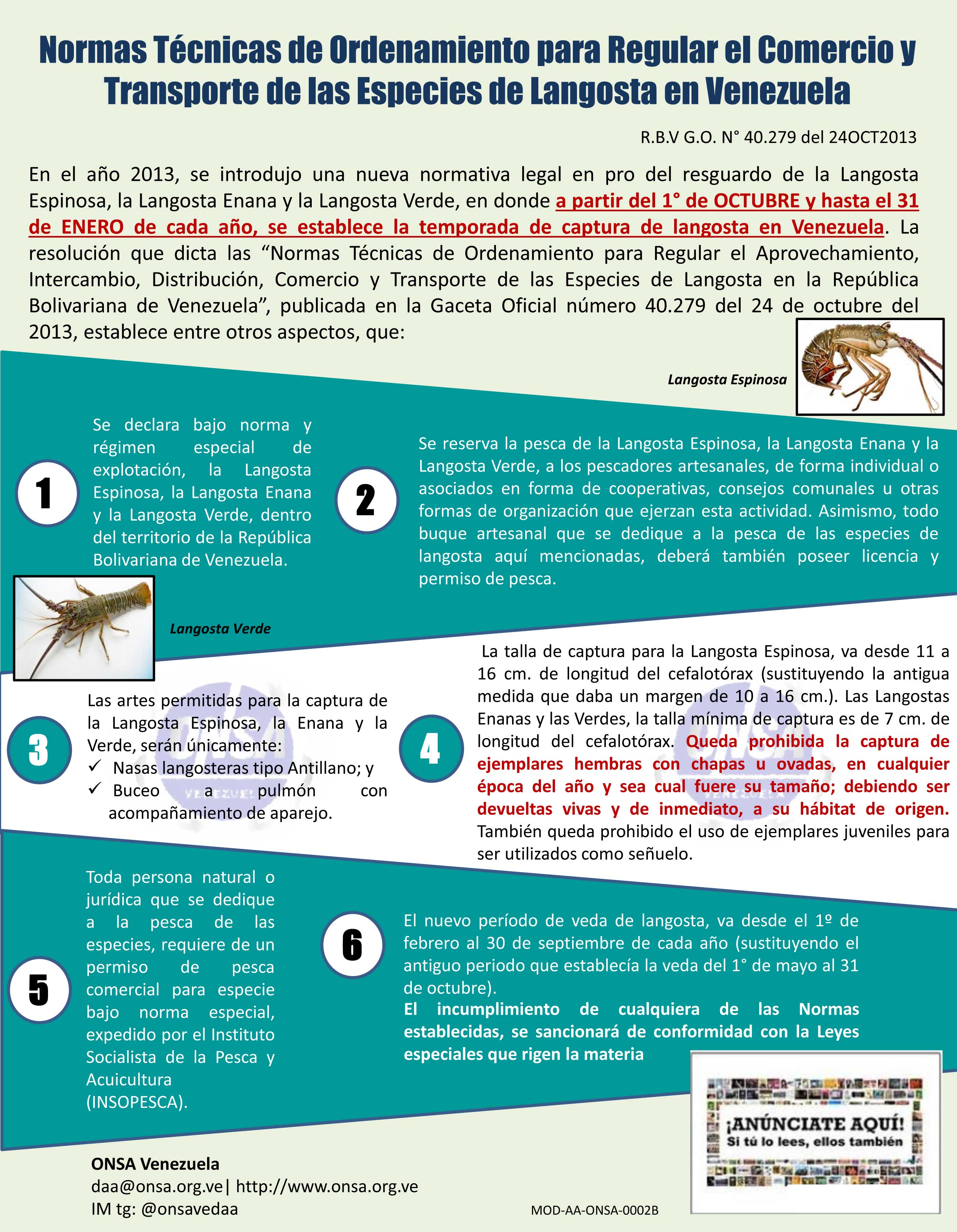 En el año 2013, se introdujo una nueva normativa legal en pro del resguardo de la Langosta Espinosa, la Langosta Enana y la Langosta Verde, en donde a partir del 1° de OCTUBRE y hasta el 31 de ENERO de cada año, se establece la temporada de captura de langosta en Venezuela. La resolución que dicta las “Normas Técnicas de Ordenamiento para Regular el Aprovechamiento, Intercambio, Distribución, Comercio y Transporte de las Especies de Langosta en la República Bolivariana de Venezuela”, publicada en la Gaceta Oficial número 40.279 del 24 de octubre del 2013, establece entre otros aspectos, que:
