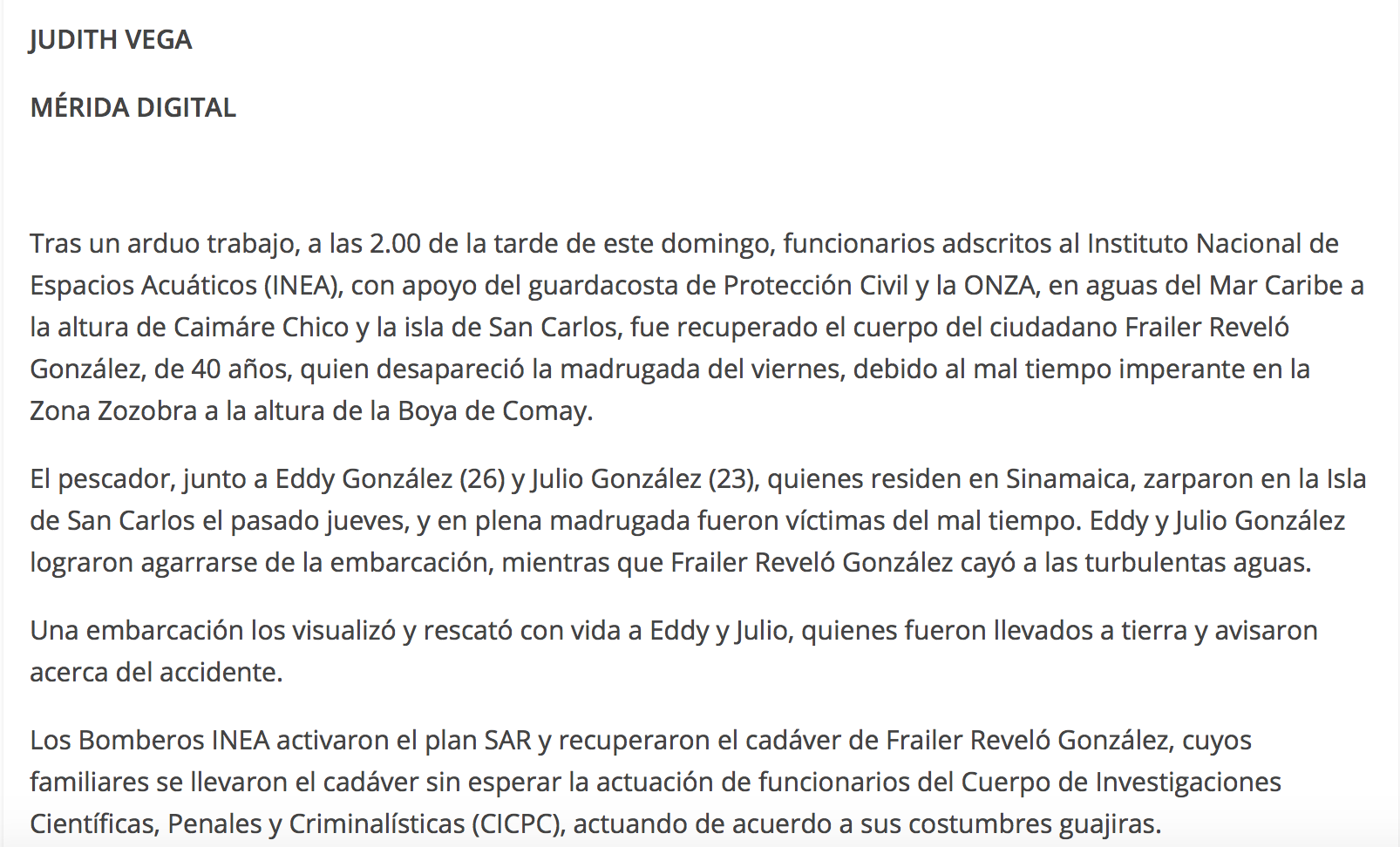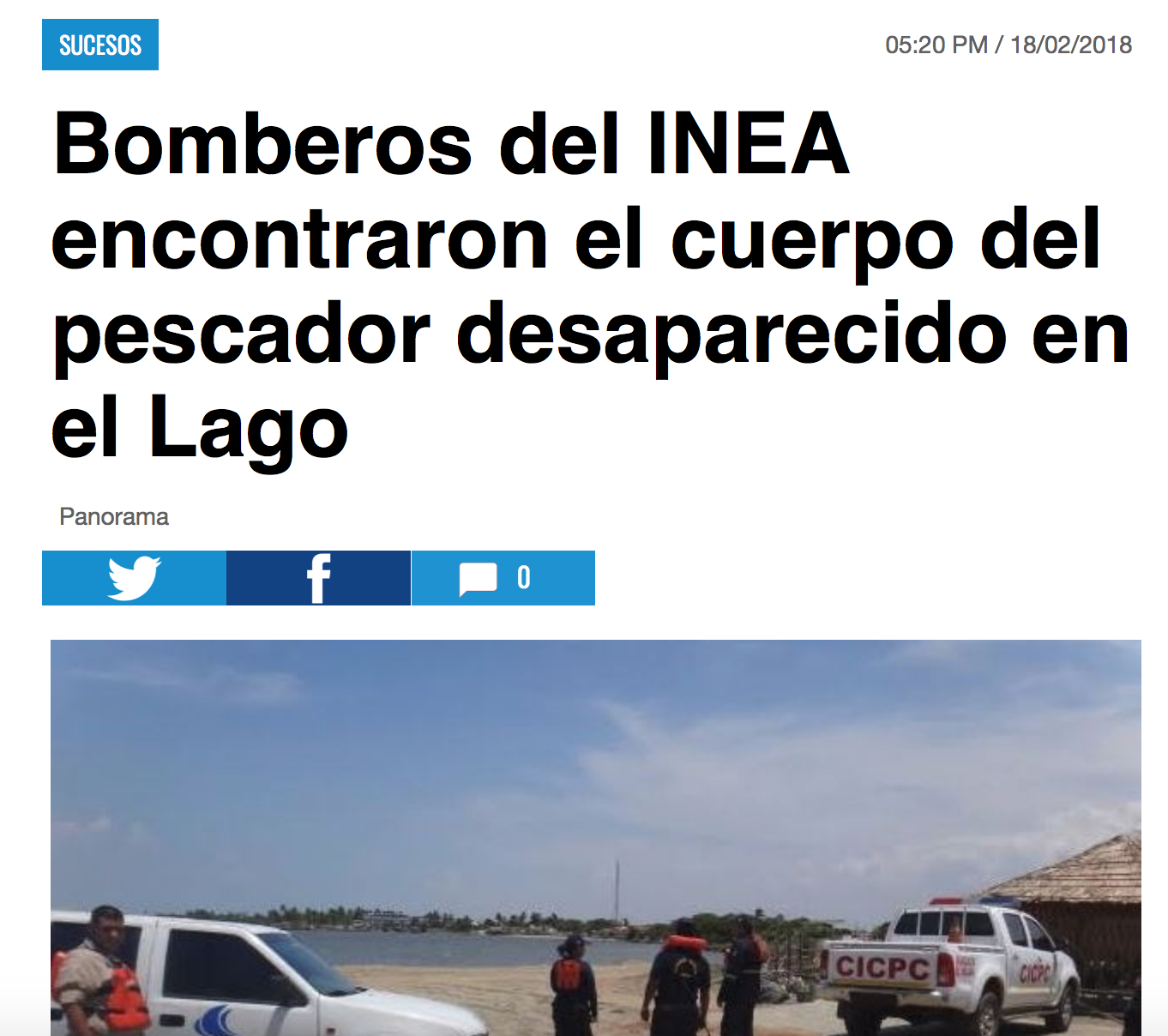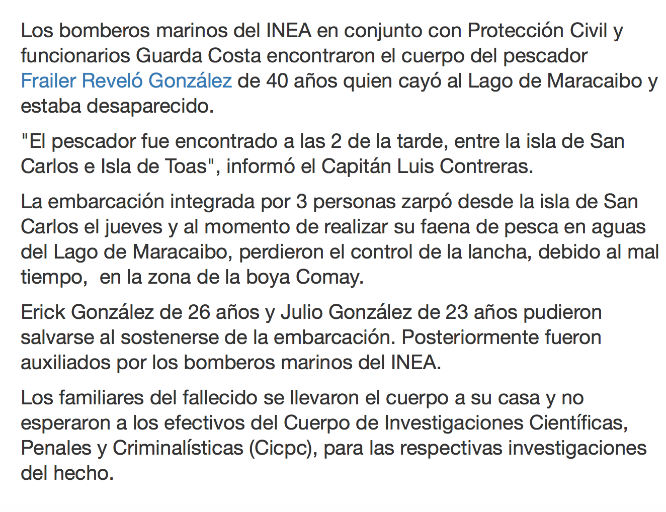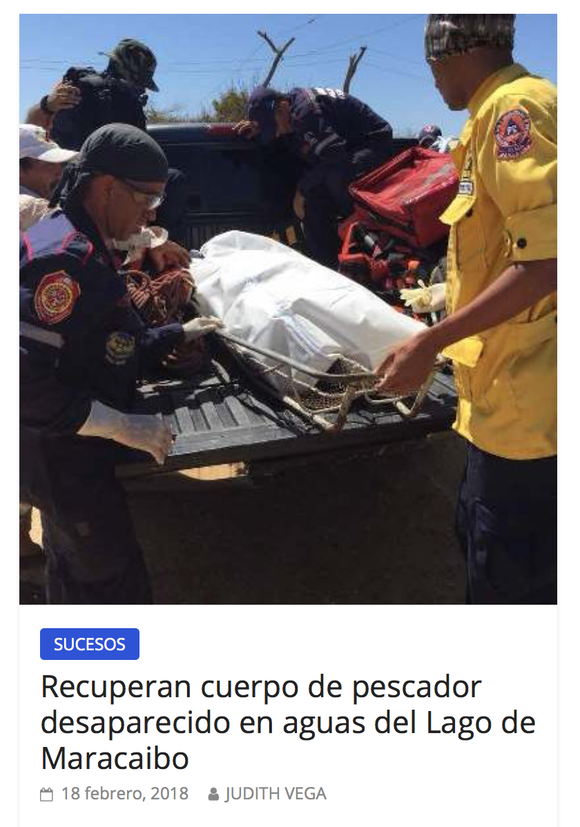 El Cuerpo se recuperó en el sector Las Balzas, entre Caño Paijana y la isla de San Carlos. Corresponde a Frailes Caya Reverol González C.I. V-15.446.015. Fue entregado a sus familiares, a que pertenece a la etnia Wayuu.