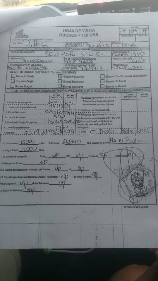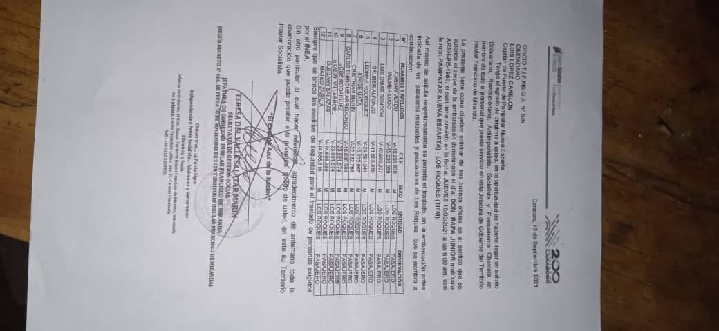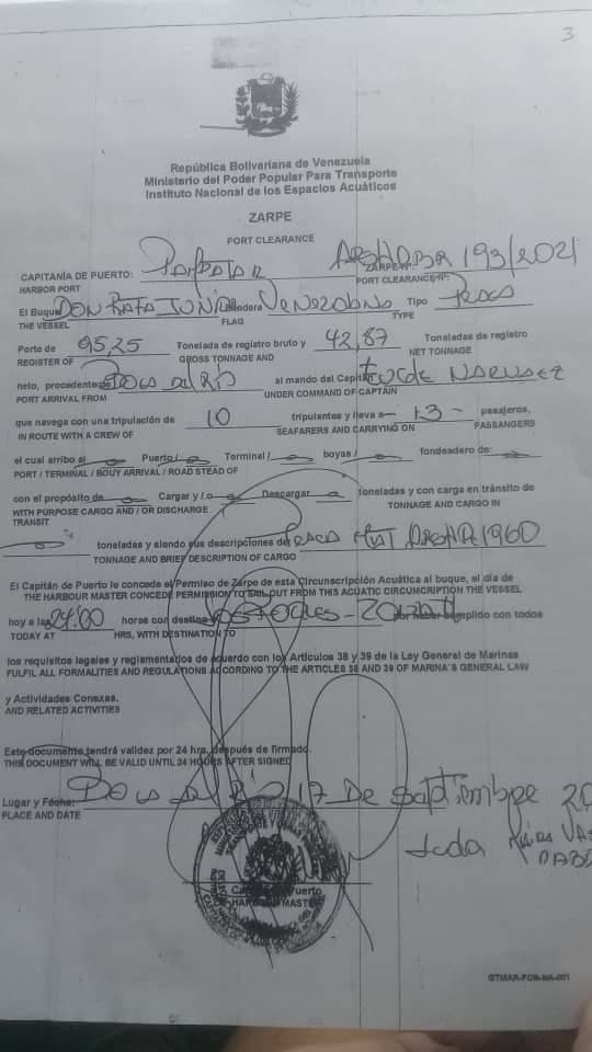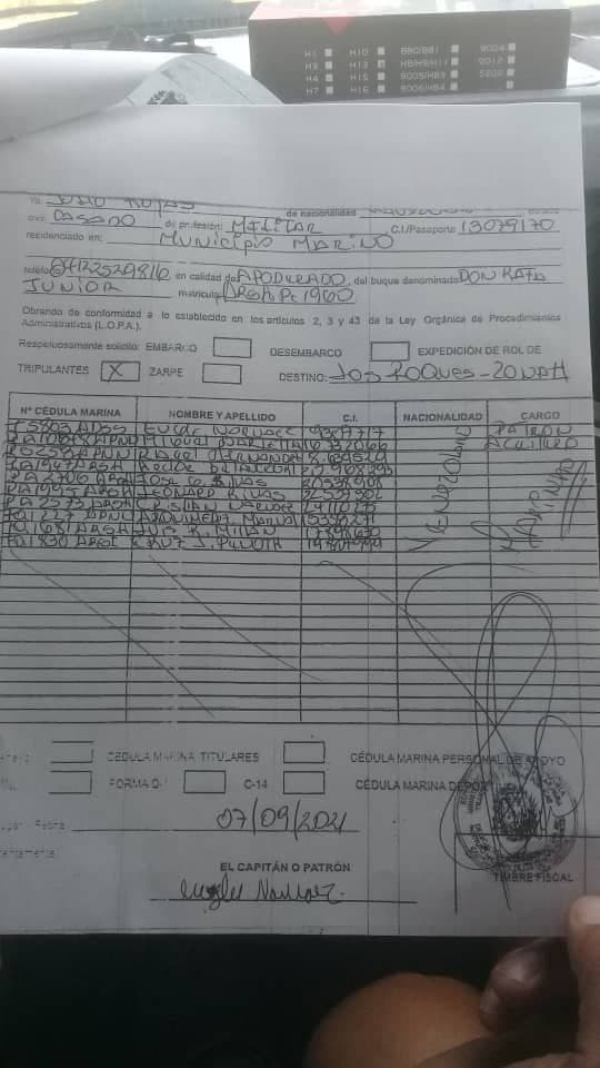 LISTA DE PERSONAS A BORDO TRIPULANTES 01. Eugle R. Narváez García C.I.V-9.307.717 ... (Capitán) 02. Miguel Antonio Barletta C.I.V-16.732.066 .. (Aceitero) 03. Carlos E. Arredondo C.I.V-16.696.588 04. José Silva Figueroa C.I.V-20.538.908 05. Cruz José Penoth C.I.V-19.807.999 06. Christian Narváez C.I.V-24.110.275 07. Leonard Rivas C.I.V-29.537.302 08. Luis Ramón Millán Marín C.I.V-17.891.630 09. Héctor Betancourt C.I.V-20.968.293 -- 10. Arquímedes Marval C.I.V-13.358.271........ (desaparecido) PASAJEROS 01. Esmel Ordaz Marval C.I.V-16.037.140 02. Olegary Salazar C.I.V 14.686.389 03. Mateo José Sabala C.I.V-14.686.616 04. Christian Marín Salazar C.I.V-22.282.766 05. Stalin Villarreal C.I.V-11.907.690 06. Rafael L. Hernández B. C.I.V-8.639.529 07. Gruber Alfonzo C.I.V-11.855.870 08. José Rodríguez C.I.V-16.826.115 09. Luis Omar Rondon Marval C.I.V-10.950.207 10. Wilmer Lugo C.I.V-.15.236.067 11. Jordan Verdú C.I.V-19.293.878 12. Leomar Rodríguez C.I.V-29.591.041 13. Jorge Mata C.I.V- 15.203.867 -- 23 POB Total -- 22 Salvados 01 Desaparecido