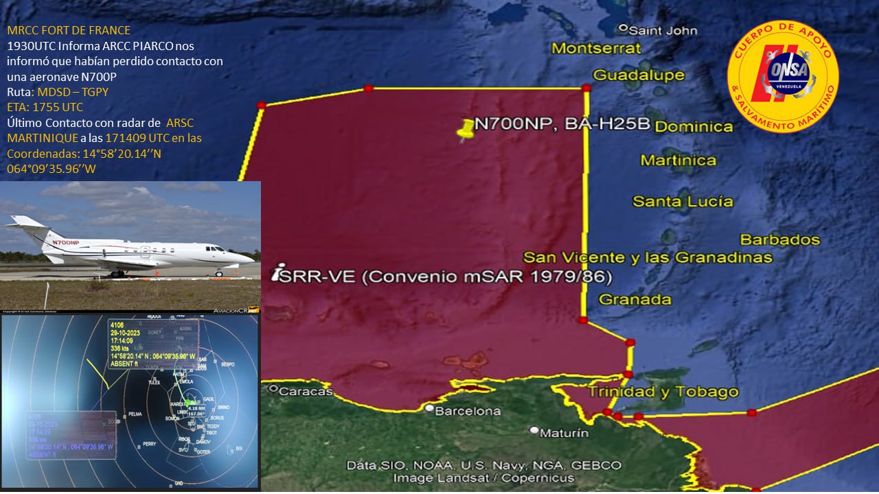 DETRESFA: N700NP, BA-H25B MENSAJE DE EMERGENCIA/EMERGENCY MESSAGE REF.: http://www.onsa.org.ve/sar/? FECHA/HORA: 29 1414Q OCT2023 DE|FROM: ONSA Venezuela TEL. CONTACTO|PHONE: +58 414 3007760 E-MAIL: securite@onsa.org.ve PARA|TO: ONSA/REM E-MAIL: sar@onsa.org.ve A. IDENTIDAD DEL ACCIDENTADO: Nombre: N700NP, BA-H25B ID/Matrícula: N700NP Nacionalidad: USA B. POSICIÓN: l: 14 º 58 ' 20 '' N - L: 064 º 09 ' 36 '' W C. SITUACIÓN: MENSAJE DE EMERGENCIA del 29 1414Q OCT2023 . RELAY DEL RCC-FDF: ARCC PIARCO nos informó que habían perdido contacto con una aeronave en su área de responsabilidad de la Región de Información de Vuelo, que también corresponde a su área de Búsqueda y Rescate. El avión salió de Santo Domingo rumbo a Granada, con llegada prevista a las 17:55 horas. El último contacto con la aeronave se produjo a las 17:14 horas Z en la posición 14°58'20,14"N - 064°09'35,96"W El avión es un bimotor, registrado como N700NP, BA-H25B. Aquí está el contacto de ARCC PIARCO: +1 868 669 48 52. No se tiene más información o rastro de vuelo del N700NP- D. NÚMERO DE PERSONAS [POB]: n/d. E. ASISTENCIA REQUERIDA: BÚSQUEDA Y SALVAMENTO. M. INFORMACIÓN ADICIONAL: Las coordinadas 14°58'20.14"N - 064°09'35.96"W, en donde se perdió el contacto con la aeronave N700NP, se encuentran en la Región de Búsqueda y Salvamento Marítimo de Venezuela (SRR-VE). Mayor información en: https://bit.ly/45T8bmP . • VÉASE aquí: http://bit.ly/rzzxUU . .:BT:. ----------------- NOTA ------------------- Este MENSAJE DE EMERGENCIA fue enviado desde el CENTRO DE MENSAJERÍA DE EMERGENCIA de la ONSA/REM localizado en: http://www.onsa.org.ve/sar y corresponde al MOD-ME-CASMAR-0001/01 de acuerdo al PLAN OPERATIVO VIGENTE (POV) [v.2.10], promulgado por el COMANDO NACIONAL de ONSA Venezuela de fecha 01AGO2017. Se recomienda que esta información sea verificada con la fuente primaria pertinente, antes de cualquier acción. Esto es un mensaje AUTÉNTICO con fines de apoyo informativo y sujeto a VERIFICACIÓN por las partes involucradas, enviado a la lista de distribución privada de entes y autoridades mSAR, relacionados con los espacios acuáticos en la región Caribe y Venezuela. El envío de información NO relacionada exclusivamente a una CASO SAR, podrá acarrear sanciones, civiles y penales, al ente emisor.