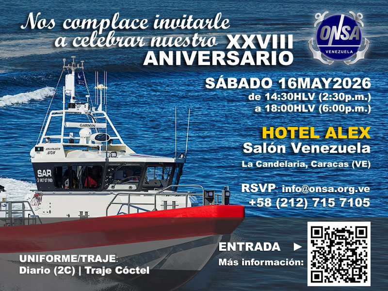 La Organización Nacional de Salvamento & Seguridad Marítima de los Espacios Acuáticos de Venezuela (ONSA A.C.), se complace en invitarle a celebrar con nosotros nuestro XXVIII (28vo.) Aniversario, el próximo sáb. 16MAY2026, en el SALÓN VENEZUELA del HOTEL ALEX, La Candelaria, Caracas, Venezuela. ...siga leyendo más abajo...